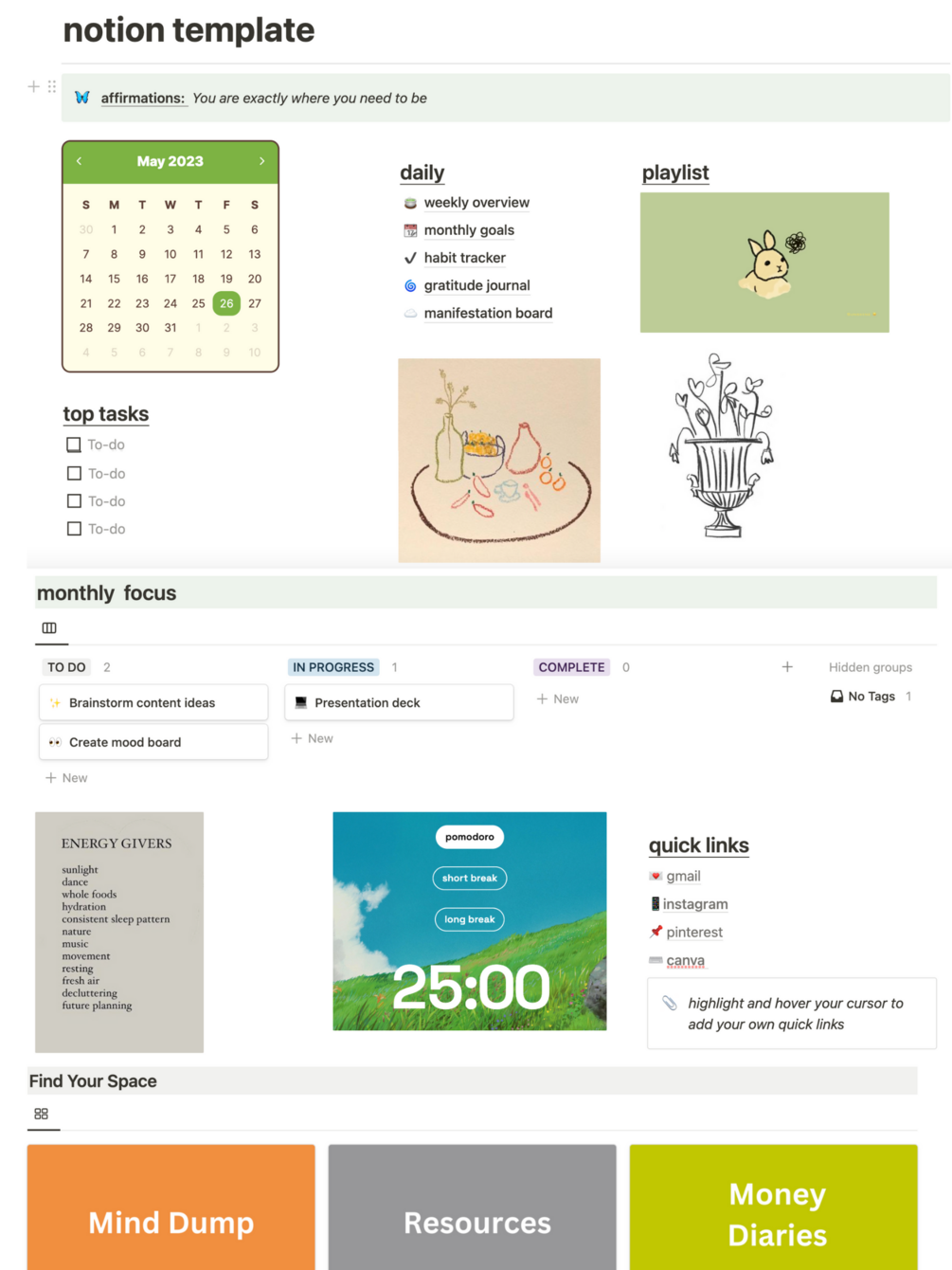 Full Dashboard Notion Template to stay inspired and productive daily!